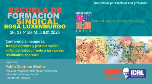 Al menos cien personas llegaron a la inauguración de la Escuela Sindical Rosa Luxemburgo que desarrolla el Instituto de Ciencias Alejandro Lipschutz (ICAL) en conjunto con la Fundación alemana Rosa Luxemburgo y que se desplegará hasta el viernes 28 de julio. La charla “Trabajo decente y justicia social: El rol del Estado frente a las nuevas realidades laborales” estuvo a cargo del Director del Trabajo, Pablo Zenteno.