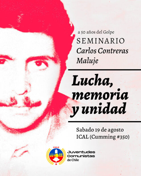En el marco de la conmemoración por los 50 años del golpe de Estado las Juventudes Comunistas de Chile (JJCC) desarrollarán el Seminario Carlos Contreras Maluje “Lucha, Memoria y Unidad” de las Juventudes Comunistas de Chile en el Instituto de Ciencias Alejandro Lipschutz (ICAL), en Ricardo Cumming 350, comuna de Santiago.