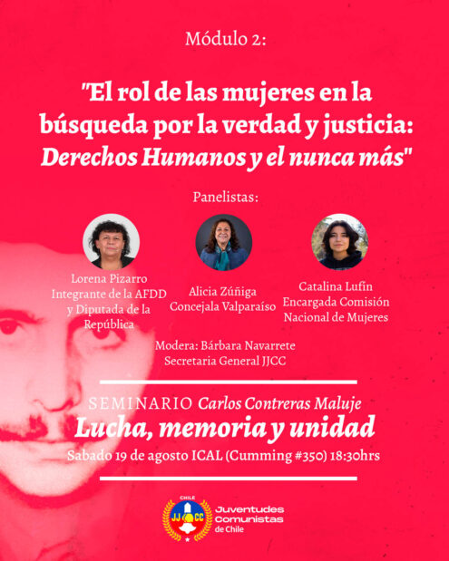 18.30 hrs a 20.00 hrs. Módulo 2: “El rol de las mujeres en la búsqueda por la verdad y justicia: derechos humanos y el nunca más”. Panelistas: Lorena Pizarro – Integrante de la AFDD y Diputada de la República. Alicia Zúñiga – Concejala comuna Valparaíso. Catalina Lufín – Encargada Comisión Nacional de Mujeres JJCC. Modera: Bárbara Navarrete – Secretaria General JJCC.
