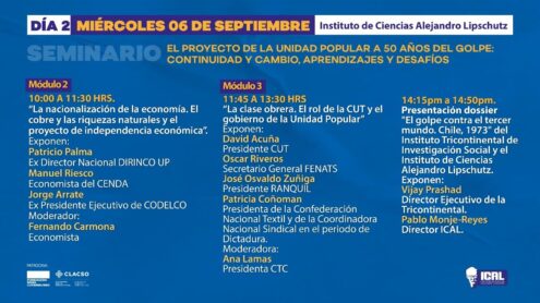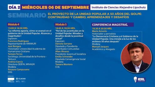 Durante toda la jornada del día miércoles se vivió en el salón del Instituto de Ciencias Alejandro Lipschutz (ICAL) el Seminario “Continuidad, Cambio, Aprendizajes y Desafíos del Proyecto de la Unidad Popular”, que estará desarrollándose hasta el viernes 8 de septiembre.